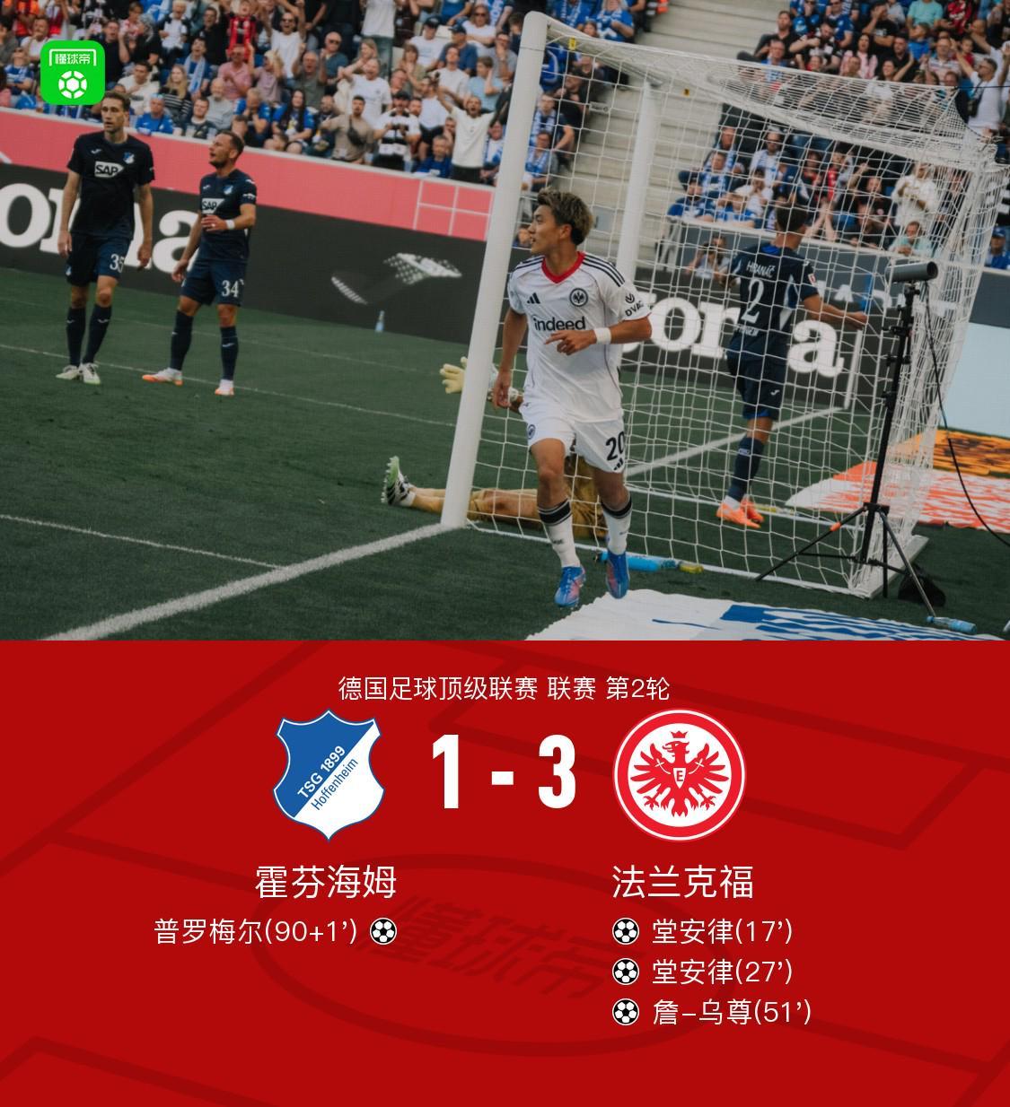 开云体育-法兰克福3-1霍芬海姆,堂安律两球,詹-乌尊建功